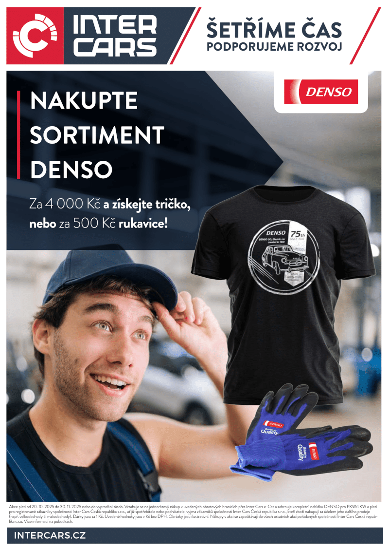 - Za jednorázový odběr 4 000 Kč ze sortimentu DENSO získáte tričko za 1 Kč; při nákupu od 500 Kč jsou připraveny rukavice za 1 Kč.
