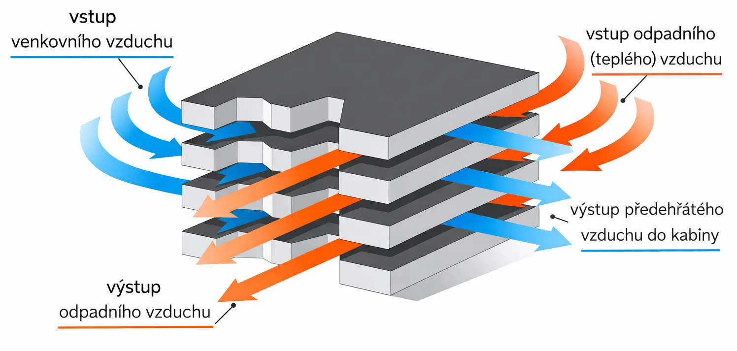Pro dosažení maximální účinnosti může být ventilační jednotka doplněna také o rekuperační jednotku s účinností až 50 %. Využití již jednou ohřátého vzduchu představuje zásadní přínos pro úsporu energie během provozu lakovacích kabin a výrazně snižuje energetickou náročnost celého procesu (obr. 2). Termoventilační jednotky mohou být vybaveny tepelnými rekuperátory, jejichž desky ohřívá odpadní vzduch, který je během fáze lakování a sušení zahříván přibližně na 20 až 22 °C. Čerstvý vzduch nasávaný zvenku, který proudí do lakovacího boxu, je pak v sousedních kanálech díky takto akumulovanému teplu (obr. 3 a obr. 4) předehříván. Dosažení požadované teploty nasávaného vzduchu je díky tomu výrazně méně energeticky náročné. Největšího efektu se dosahuje ve studených měsících během podzimu, zimy a jara, kdy je rozdíl mezi teplotou nasávaného čerstvého vzduchu a vypouštěného ohřátého vzduchu největší. Díky použití rekuperačních jednotek lze dosáhnout úspor energie až kolem 50 %. Výhodou je, že rekuperační jednotky lze dodatečně instalovat také k již dříve pořízeným lakovacím a sušicím boxům, což umožňuje modernizaci stávajících provozů bez nutnosti kompletní výměny technologie.