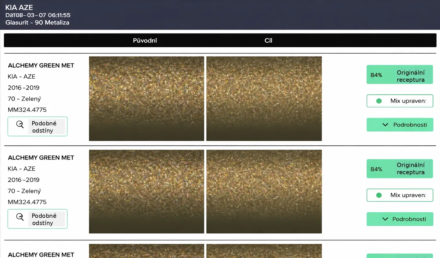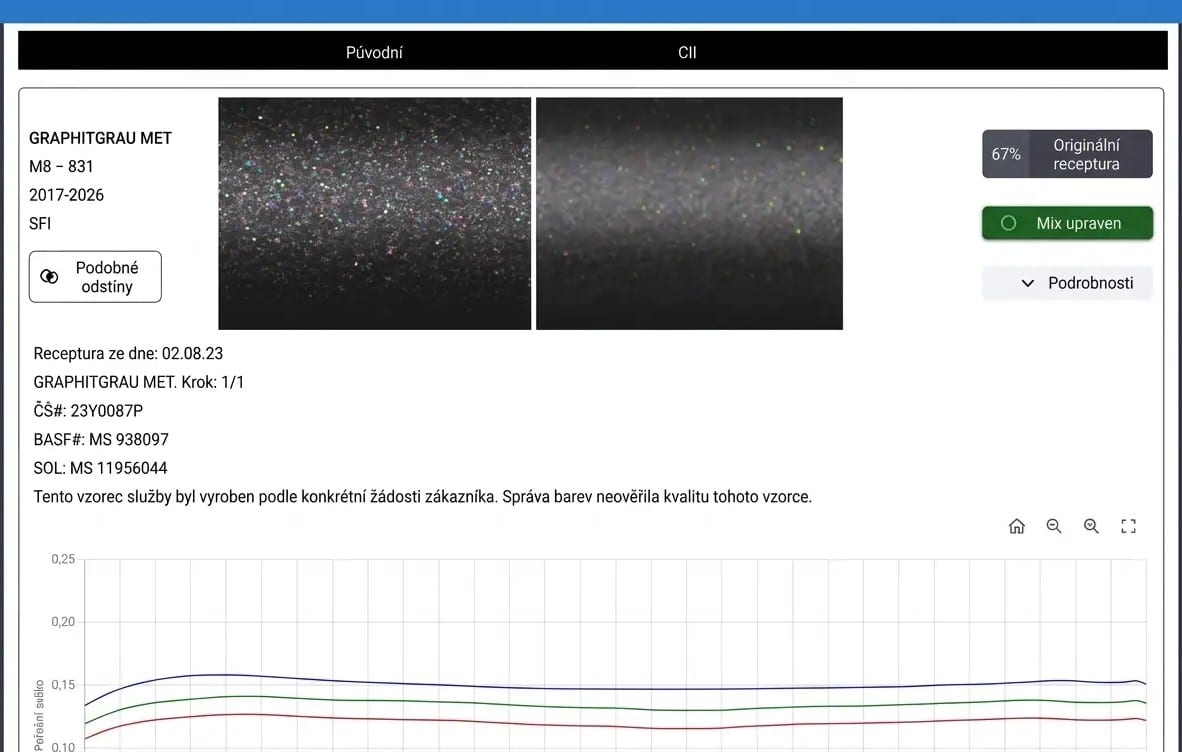 Výrobce Glasurit má jako jeden z prvních již 20 let pro opravy dobře vymyšlený systém matných laků, kde se míchá extramatný lak s matným lakem v určitém váhovém poměru a při zachování tloušťky vrstev a doby odvětrání to perfektně funguje. Pomocí spektrometru Glasurit s programem Refinity se dá vyhledat nejlepší shoda, zobrazit efektové částice a přepočítat receptura k nejlepšímu výsledku (obr. 6).