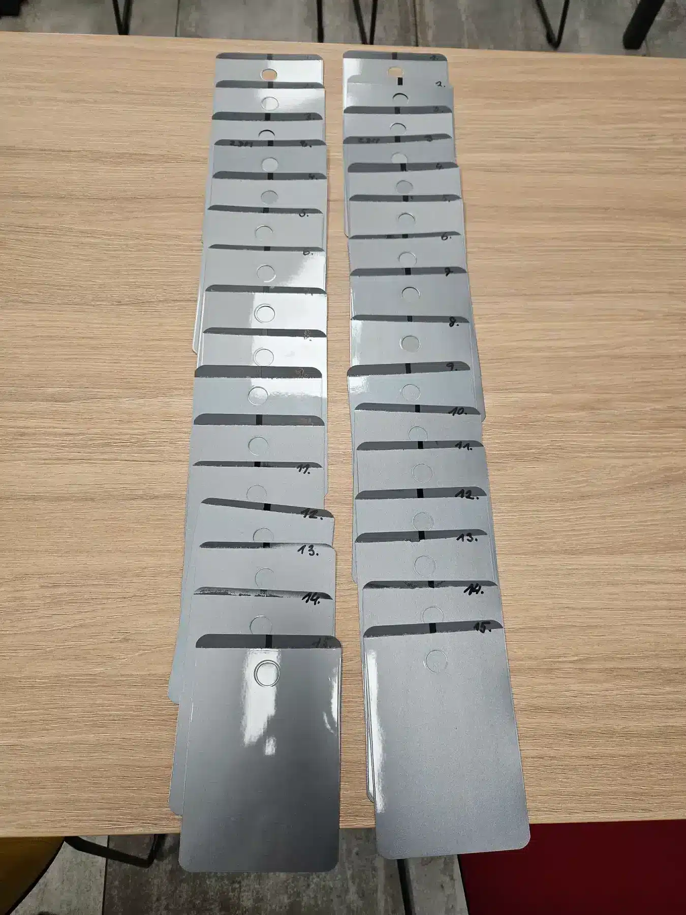 Je potřeba si uvědomit, kolik stojí jeden vzorek: 0,1 litru barvy 300 Kč, 0,1 litru laku 200 Kč, spotřební materiál 100 Kč, práce 0,5 hodiny 700 Kč, energie kabiny 150 Kč. Celkem asi 1 450 Kč za jeden vzorek. Většinou si to nikdo neuvědomí, tak malý plíšek – a kolik stojí (obr. 4). Ano, je to tak.
