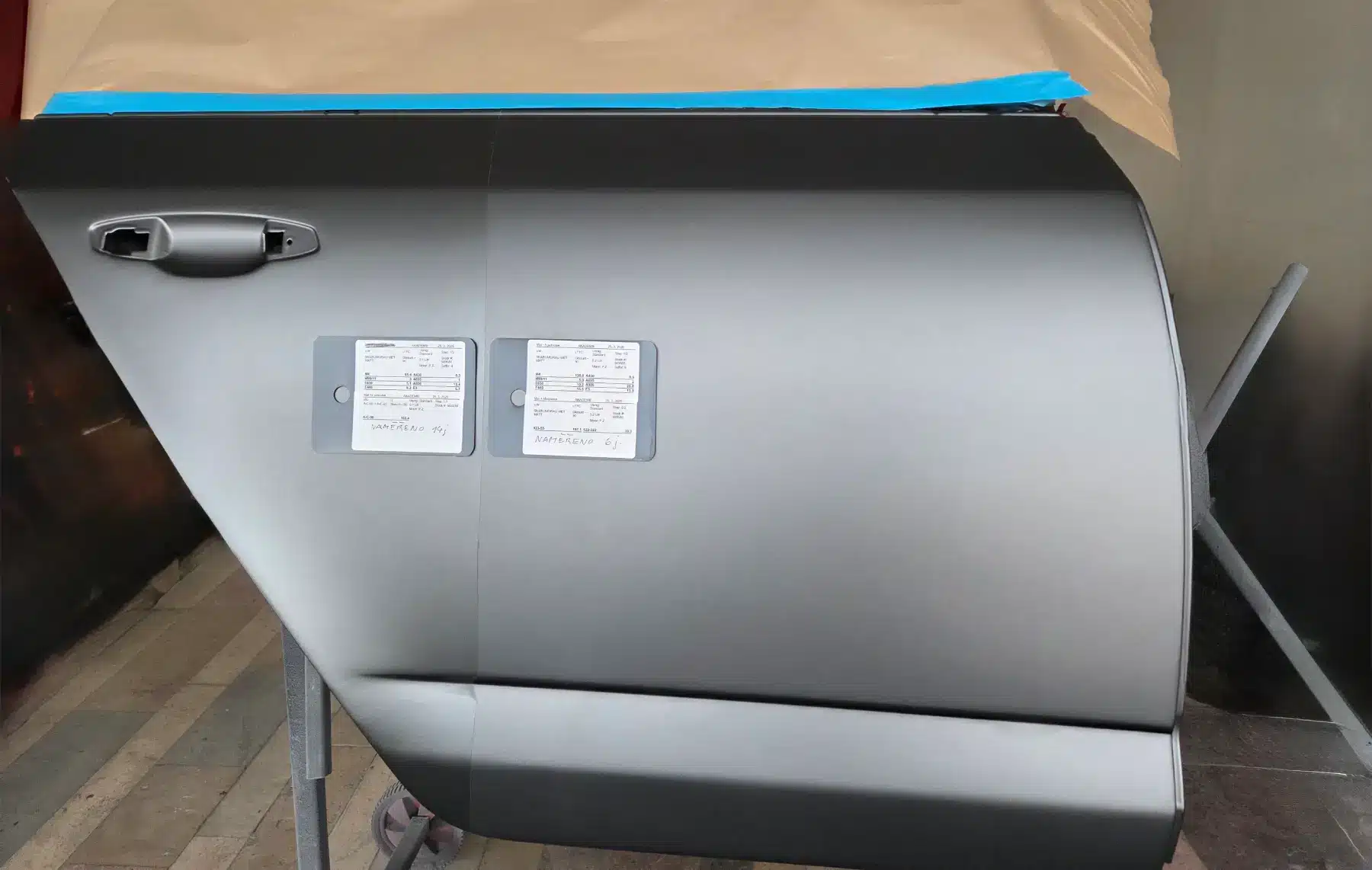 Dvouvrstvé lakování s efektními částicemi. Při domíchávání se trochu předpokládá, že odstín nebude úplně přesný. Místo nákladného domíchávání je často jednodušší opravu rozstříknout do sousedních dílů. Horší je situace, kdy lakujete přední nárazník a kapota navazuje na lakovaný díl – tam rozstřik nejde použít, protože by se musela stříkat celá přední část vozu. Vždy se rozhodujte podle sebe – chtěli byste to na svém autě? Nechtěli? Snažte se odstín domíchat co nejlépe.
