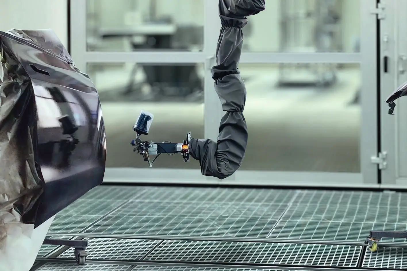 Roboty pro lakování v současné době zkoumají téměř všichni dodavatelé lakovacích materiálů. Stejně jsou na tom výrobci lakovacích pistolí. Existují různé způsoby, jak s robotem v lakovací kabině pracovat. Někteří jej zavěšují ze stropu kabiny (obr. 1), zatímco jiní ho nechávají na podlaze. V obou případech jsou potřeba kolejnice, které definují dráhu robota při jeho pohybu kolem vozidla nebo lakovaného dílu. Robotické rameno nanáší barvu – a to rovnoměrněji, než by to dokázal člověk.