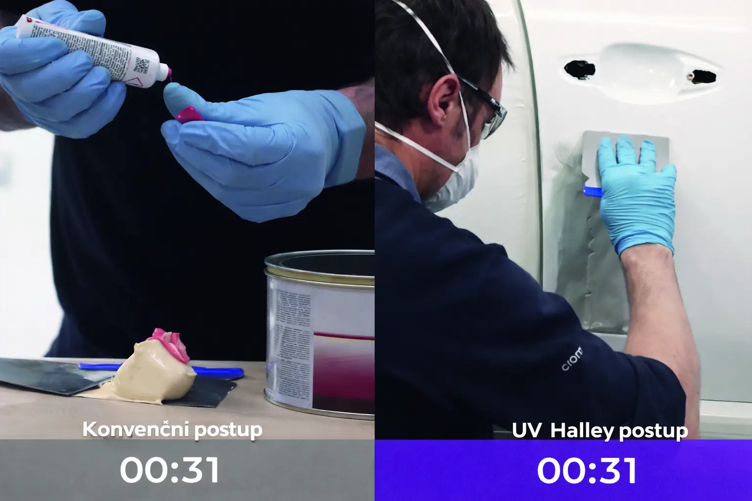 Při opravách karoserie se při standardním postupu běžně používají dvousložkové materiály, ty ale vyžadují čas na chemickou reakci a následné schnutí. Tyto technologické přestávky mohou výrazně prodloužit celkový čas opravy.
