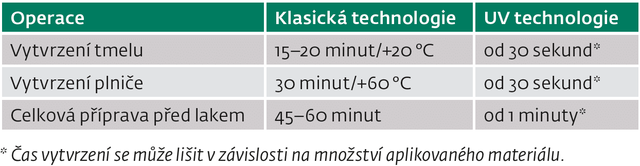 UV produkty fungují na jiném principu. Jednokomponentní materiál vytvrdne ihned po ozáření UV lampou, a proto můžete bez dalšího čekání pokračovat v následujících pracovních krocích. Tento postup je ideální zejména pro lokální opravy laku a smart repair, které dnes tvoří významnou část práce lakoven a karosáren.