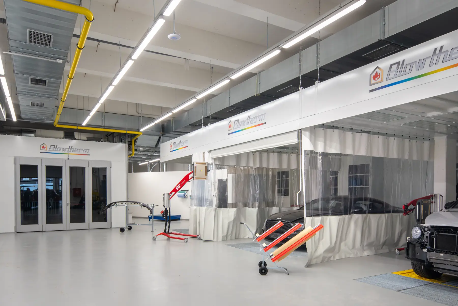 Technologickým centrem lakovny je lakovací kabina Blowtherm Extra (obr. 1) o rozměrech 8,0 × 4,5 × 2,7 m, vybavená integrovaným zvedákem. Šířka 4,5 metru umožňuje lakovat i rozměrné vozy společně s demontovanými díly v jednom cyklu. Jde o řešení navržené pro provozy s vyšší průchodností zakázek a zároveň pro práci s náročnými karoseriemi luxusních vozů. Integrovaný zvedák zlepšuje ergonomii práce, zejména při přístupu ke spodním částem karoserie.