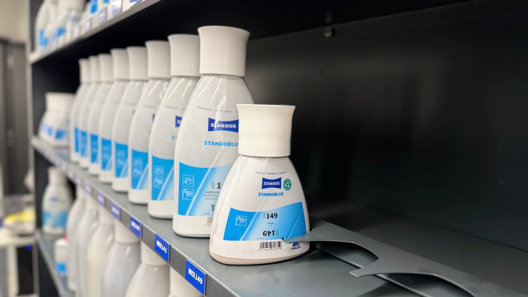 Nezbytným vybavením je míchárna barev, která slouží pro přípravu lakovacích materiálů a jejich přesné dávkování. Organizace pracoviště umožňuje rychlou a přehlednou přípravu a zároveň minimalizuje riziko chyb při míchání barev. Podle informací z prohlídky pracuje míchárna s nejnovější generací balení lakovacích materiálů Standoblue (obr. 2). Materiál není nutné několikrát denně promíchávat v klasických plechovkách s vrtulkami, ale před použitím jej stačí protřepat.