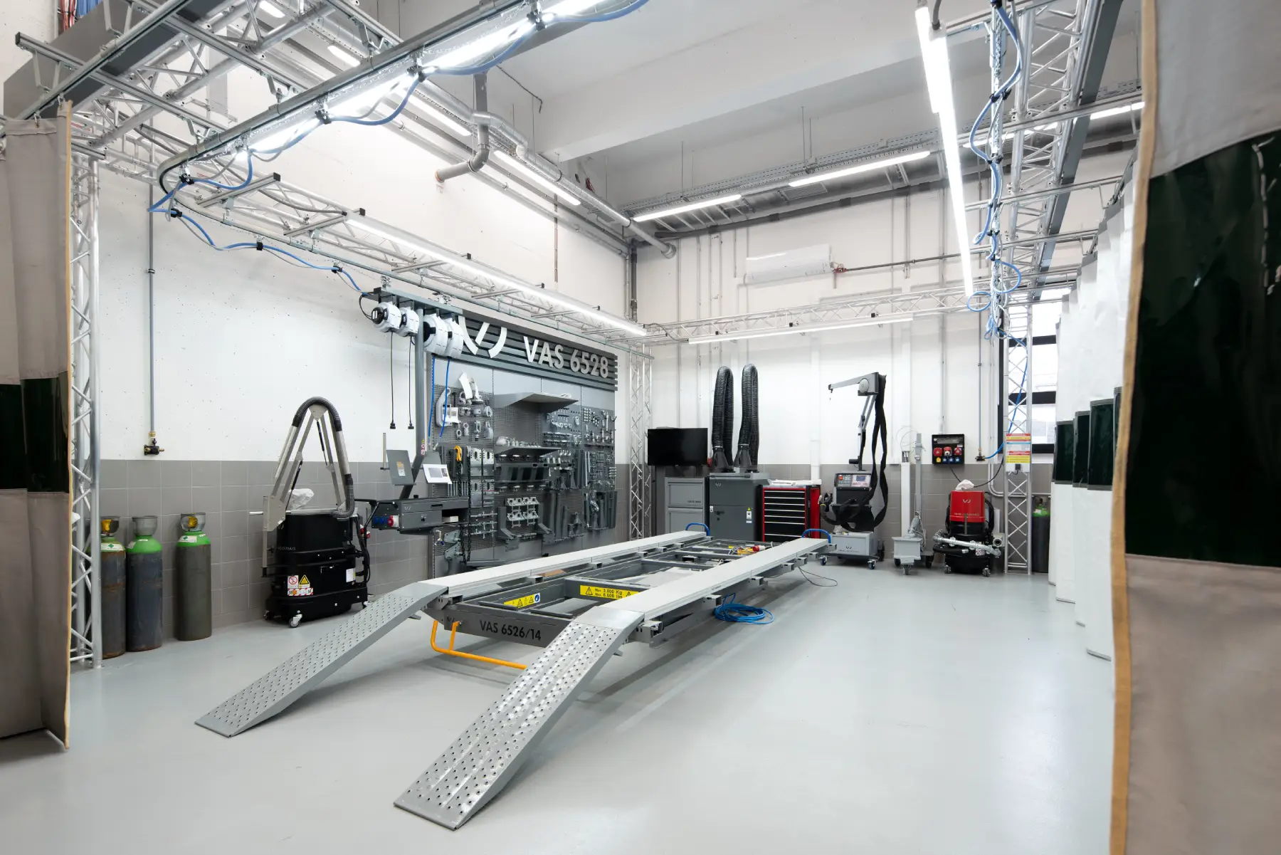 Pro rovnání karoserií je instalován velký rovnací rám Quick 42 od společnosti Car-O-Liner, doplněný měřicím systémem Car-O-Tronic a přípravky pro přesné upnutí vozidla. Přesnost měření a dokumentace oprav mají u těchto vozů zásadní význam nejen z technického hlediska, ale také pro zachování hodnoty vozu. Karosárna je dále vybavena karosářským zvedákem Speed pro strukturální opravy menšího charakteru. Každodenně ho lze využívat i jako běžný zvedák.