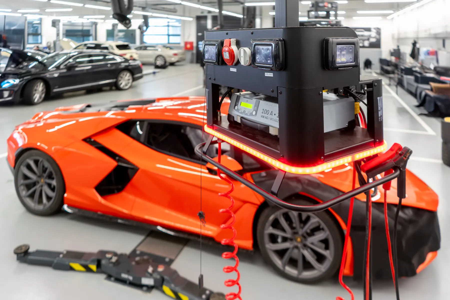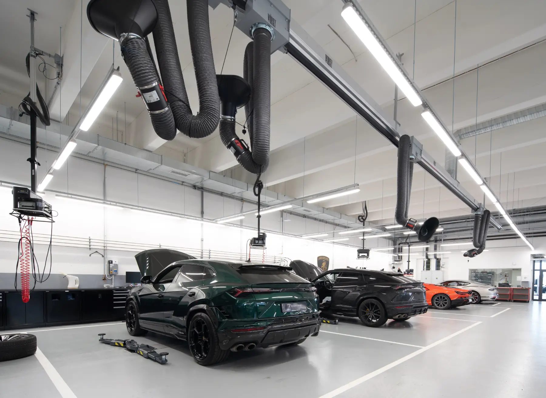 Na pracovištích Lamborghini je instalováno pět teleskopických energetických hnízd PowerLab, která integrují přívody energií, stlačeného vzduchu, datového připojení a umístění nabíječky autobaterií přímo na servisním místě (obr. 5). Mechanici mají všechny potřebné přípojky přímo u vozu, proto v pracovním prostoru nepřekážejí kabely ani další vývody. Řešení je praktické zejména proto, že tady jsou zvedáky zapuštěné do podlahy, kde nejsou klasické servisní sloupky. Takové řešení zvyšuje ergonomii práce mechaniků a zároveň přispívá k lepší organizaci pracovního prostoru.