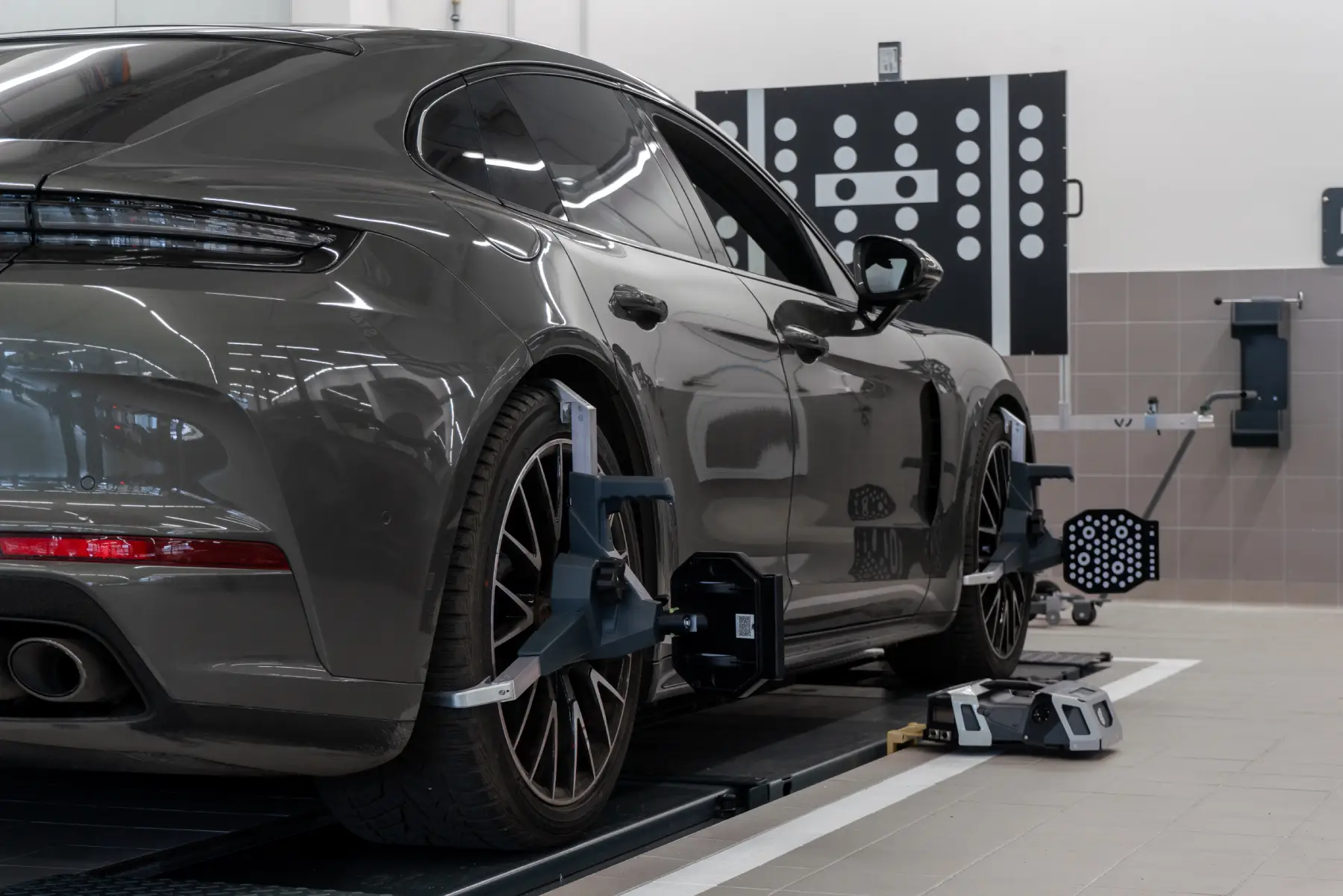 Pro nastavení podvozků slouží geometrie VAS 701011, která odpovídá standardům pro přesné měření (obr. 6). U sportovních modelů Porsche nebo Lamborghini je přesnost geometrie zásadní. U některých verzí, například Porsche 911 GT3, může seřízení podvozku trvat i několik hodin, protože se vozidlo zatěžuje podle přesně předepsaného postupu a zároveň se pracuje s velmi přesnými hodnotami, které mají přímý vliv na jízdní vlastnosti vozu.