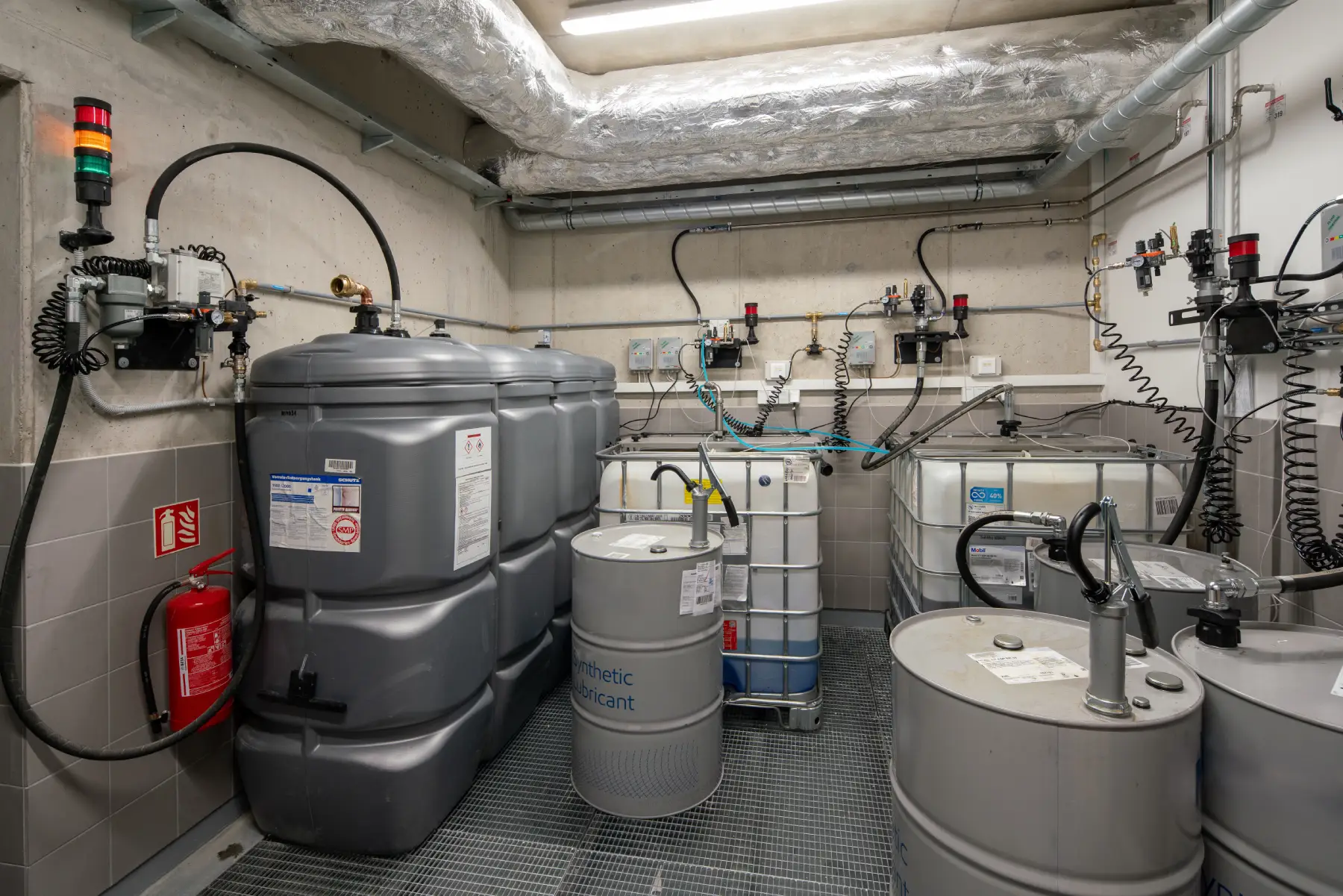 Dalším technologickým prvkem servisu je centrální olejové hospodářství pro sběr a výdej olejů a kapaliny do ostřikovačů (obr. 7). V zázemí servisního centra je instalována samostatná olejárna, odkud se oleje rozvádějí potrubním systémem k výdejním barům v jednotlivých částech dílny. Základem systému je centrální nádrž na použitý olej o objemu přibližně 2 000 litrů. Nádrž je dvouplášťová, takže splňuje bezpečnostní požadavky na skladování provozních kapalin bez nutnosti další záchytné vany. V případě výměny oleje mechanik odsaje olej z vozidla do mobilní odsávací jednotky a následně jej pomocí pneumatické pumpy přečerpá do centrální nádrže. Jakmile hladina v nádrži dosáhne stanovené úrovně, systém upozorní obsluhu a použitý olej následně odsaje autocisterna k ekologické likvidaci.