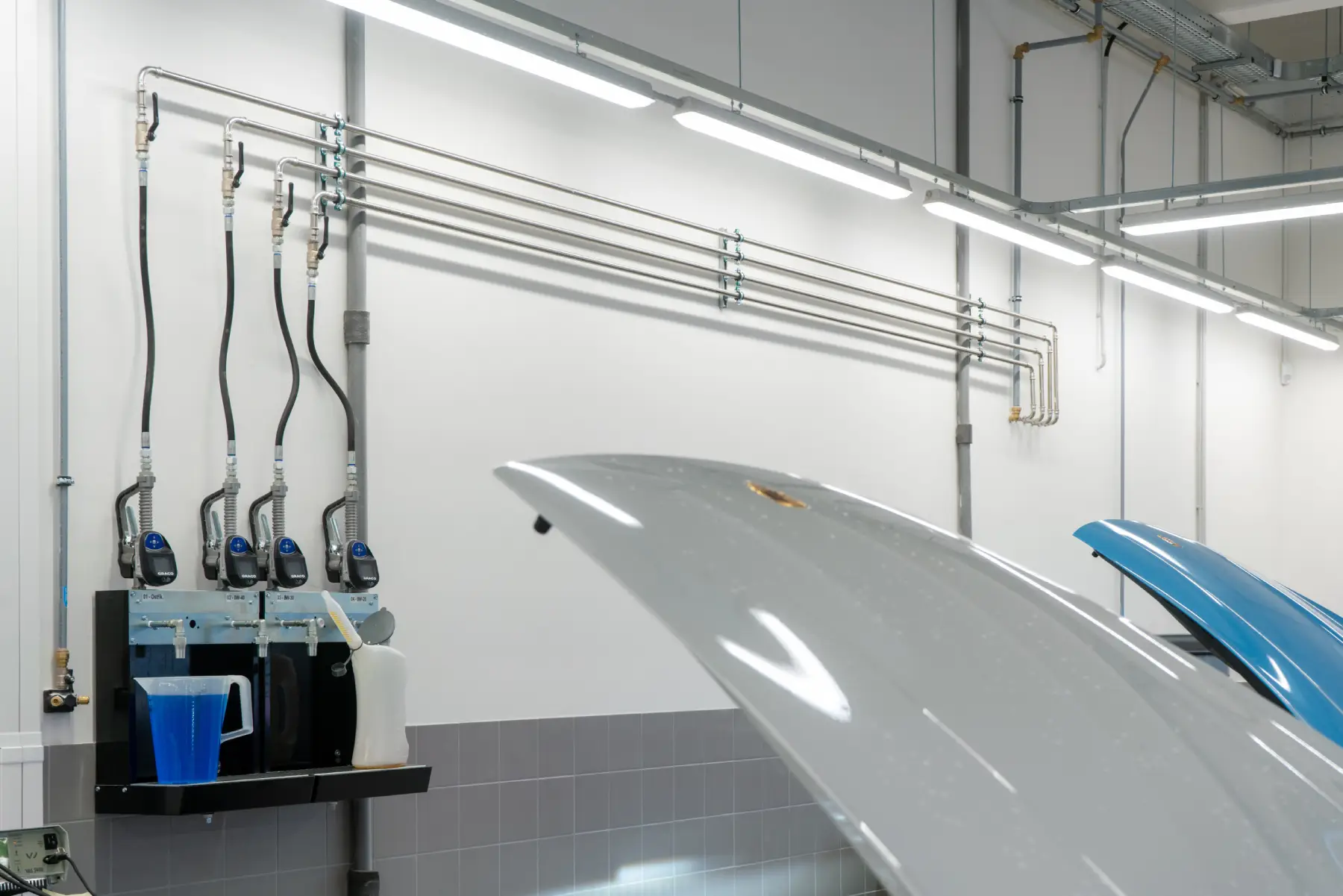 Součástí pracoviště je také poslední generace koloristického softwaru Standowin, který napomáhá přesnému dosažení odstínu, dávkování a standardizaci procesu. Součástí míchárny je také automatická myčka stříkacích pistolí B-Tec D-800, která zajišťuje rychlé a bezpečné čištění lakovacích nástrojů po dokončení práce. Automatické čištění výrazně zjednodušuje práci lakýrníků a současně přispívá ke stabilní kvalitě lakování. Na samotné lakování zde používají poslední generaci stříkacích pistolí SATAjet X.